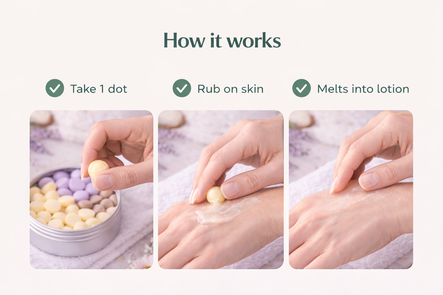 Solid lotion dots that melt into your skin — no mess, no leakage